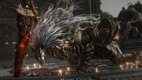 - •Phase 2 (Maliketh): he flips around aggressively -- use pillars to block his projectile slashes